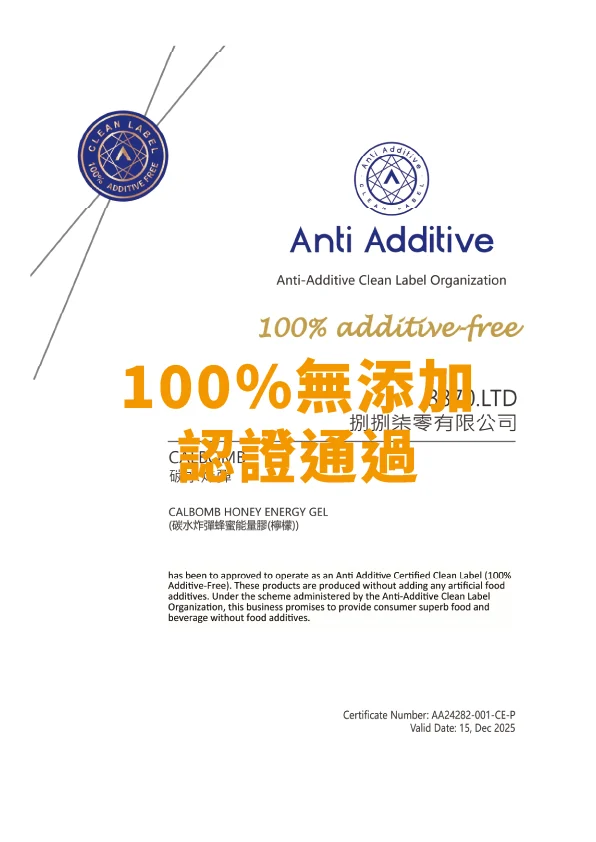 食品檢驗及相關認證蜂蜜能量膠100%無添加-認證通過 蜂蜜相關測試-均通過 蜂蜜動物性用藥檢測-未檢出 黑糖能量膠黑糖重金屬殘留測試-未檢出 台灣香檬農藥殘留-未檢出 CALBOMB軟水壺60度耐熱測試-通過 塑化劑溶出試驗-未檢出 CALBOMB不鏽鋼單車水壺重金屬殘留測試-未檢出